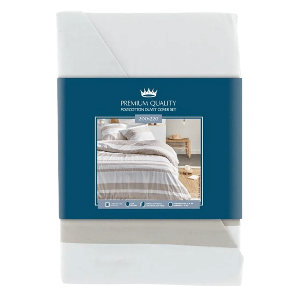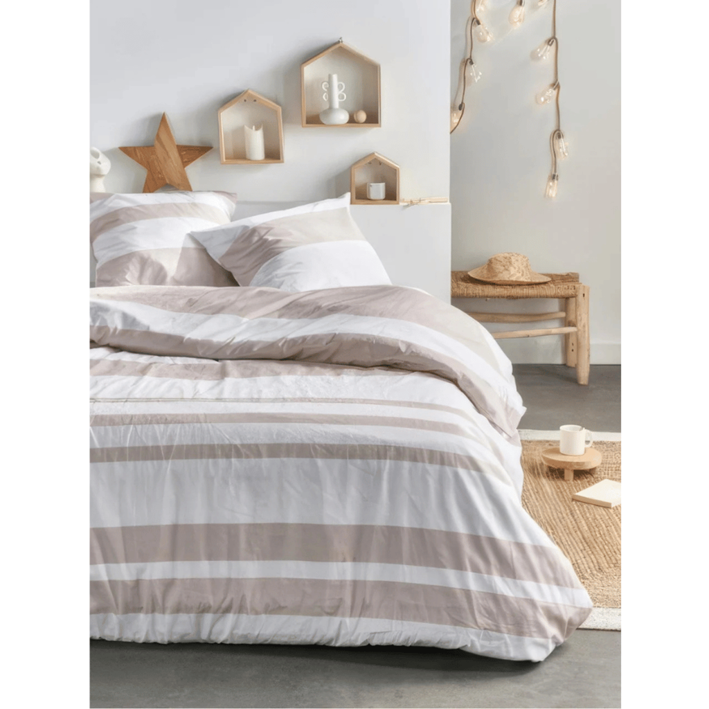 Conjunto capa de edredão e fronha, com um padrão riscado, sendo muitas vezes reversível para maior versatilidade no quarto.
