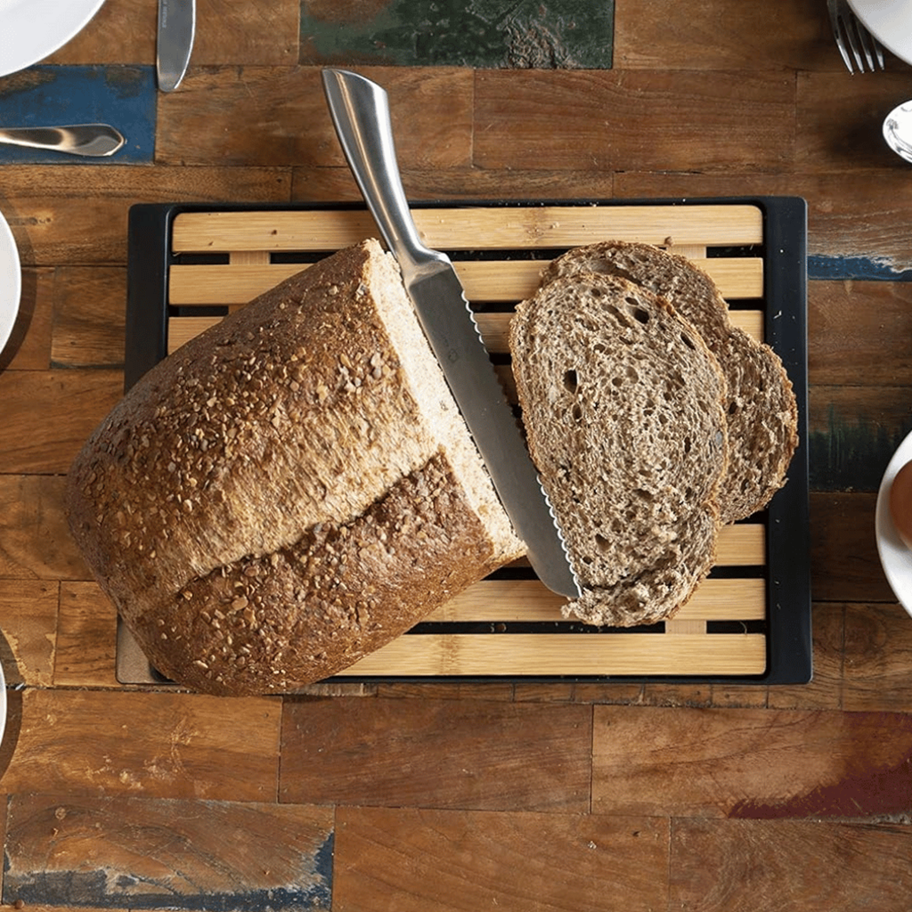 DescriçãoTábua de corte, com tabuleiro coletor de migalhas.