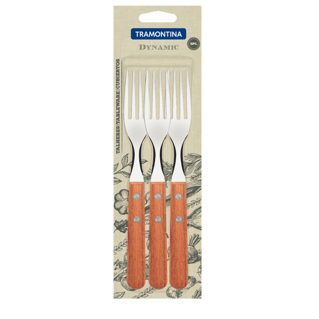 O conjunto de garfos Tramontina Dynamic em aço inox e cabo em madeira, combinam com qualquer decoração da sua casa e são muito resistentes.