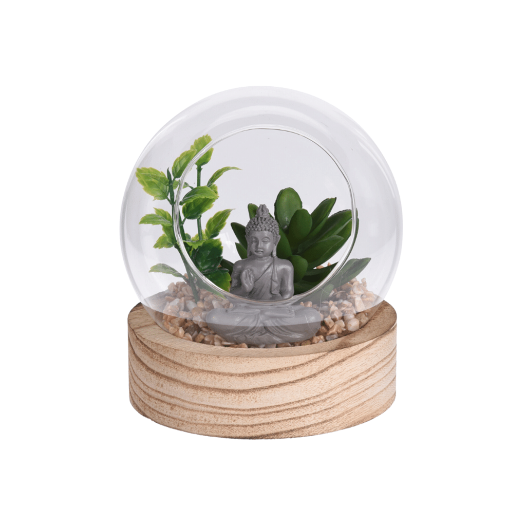 Buda envolvido em esfera de vidro com base de madeira.