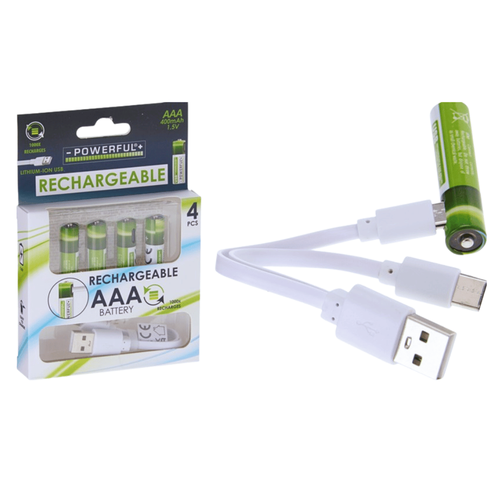 Pilhas AAA recarregáveis . Estas quatro pilhas AAA são facilmente carregadas via USB, têm a capacidade de 400 mAh e uma voltagem de 1,5 volts.