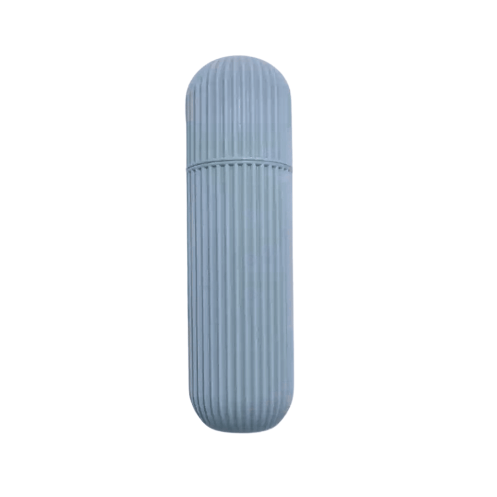 Estojo portátil para escova e pasta de dentes, ideal para viagens. O estojo veda firmemente para proteger contra pó e bactérias e tem um design em formato de cápsula com textura canelada.
