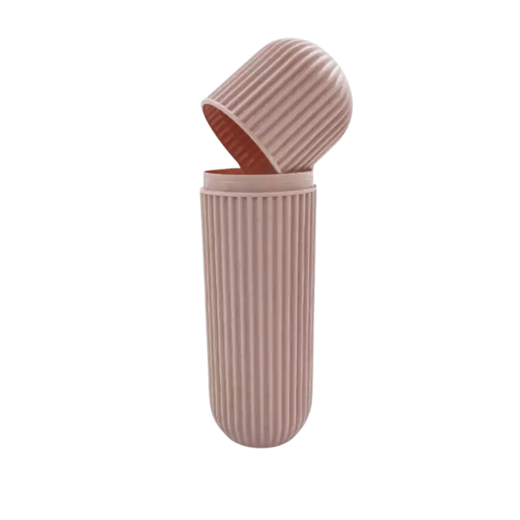 Estojo portátil para escova e pasta de dentes, ideal para viagens. O estojo veda firmemente para proteger contra pó e bactérias e tem um design em formato de cápsula com textura canelada.