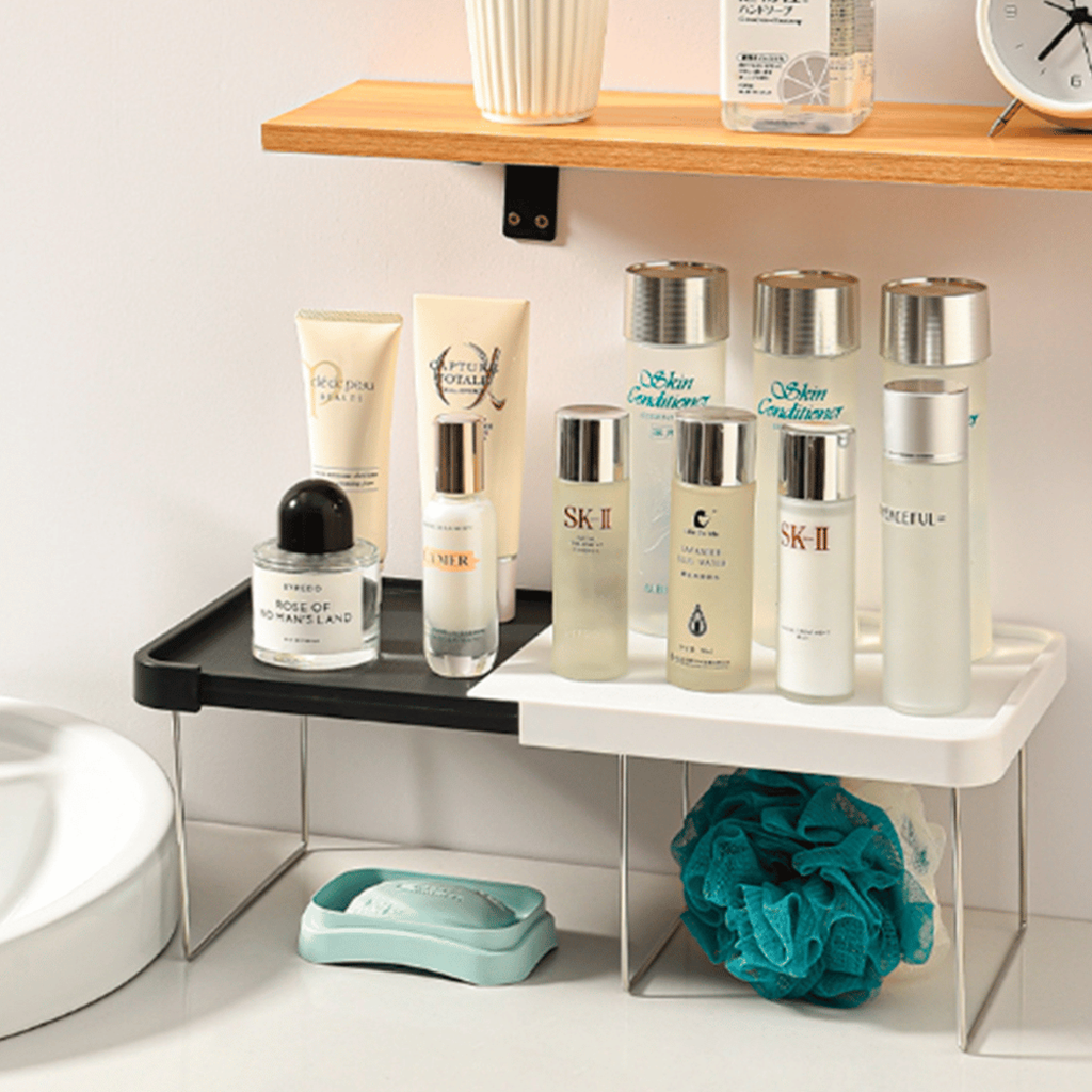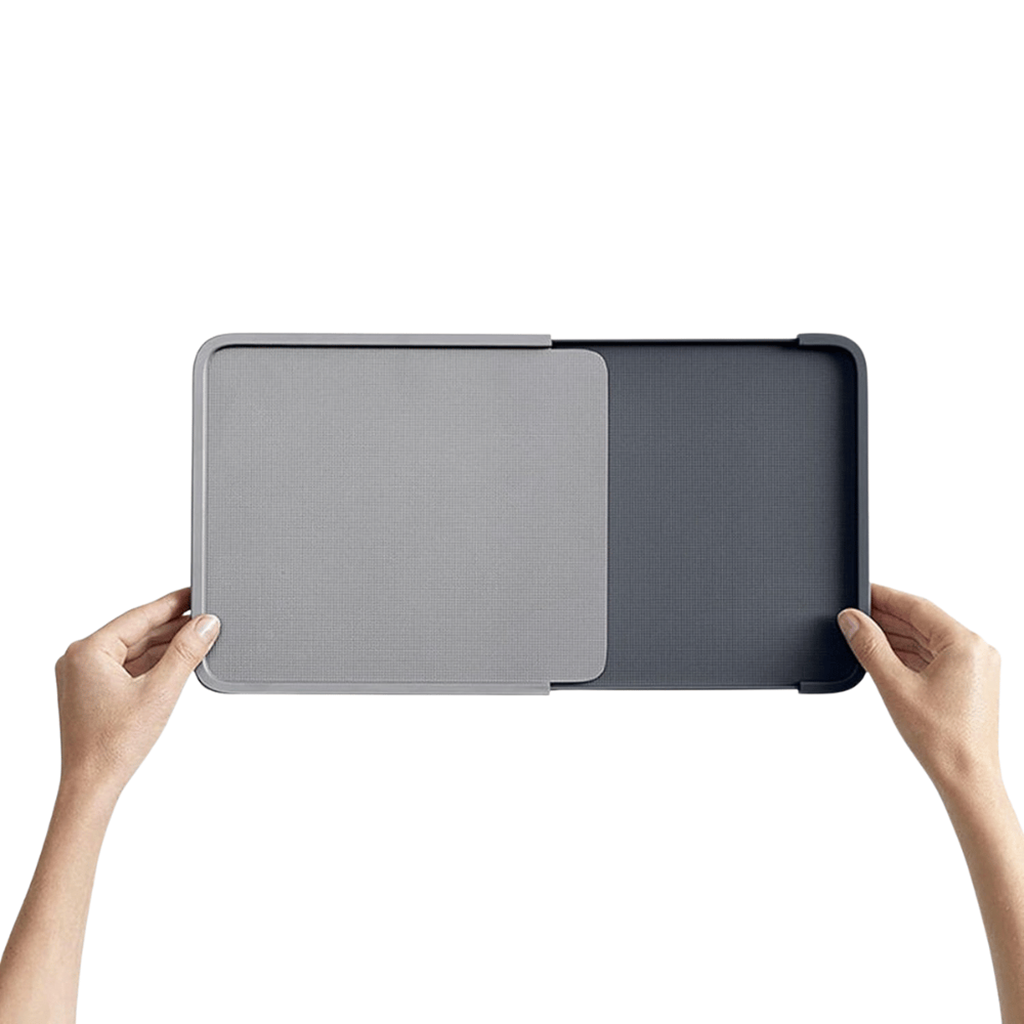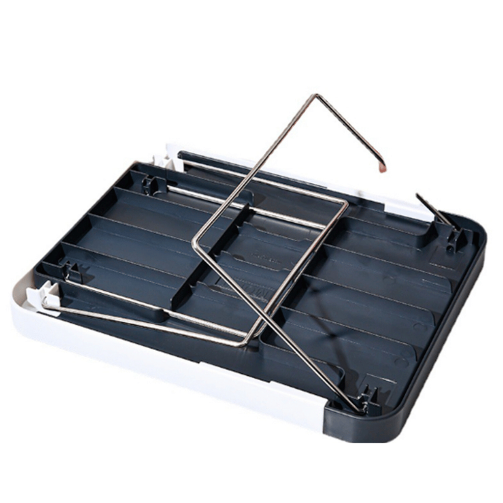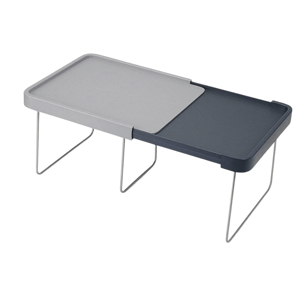 Prateleira dobrável e extensível, com superfície texturizada e bordas elevadas, que impedem eficazmente que os objetos deslizem.