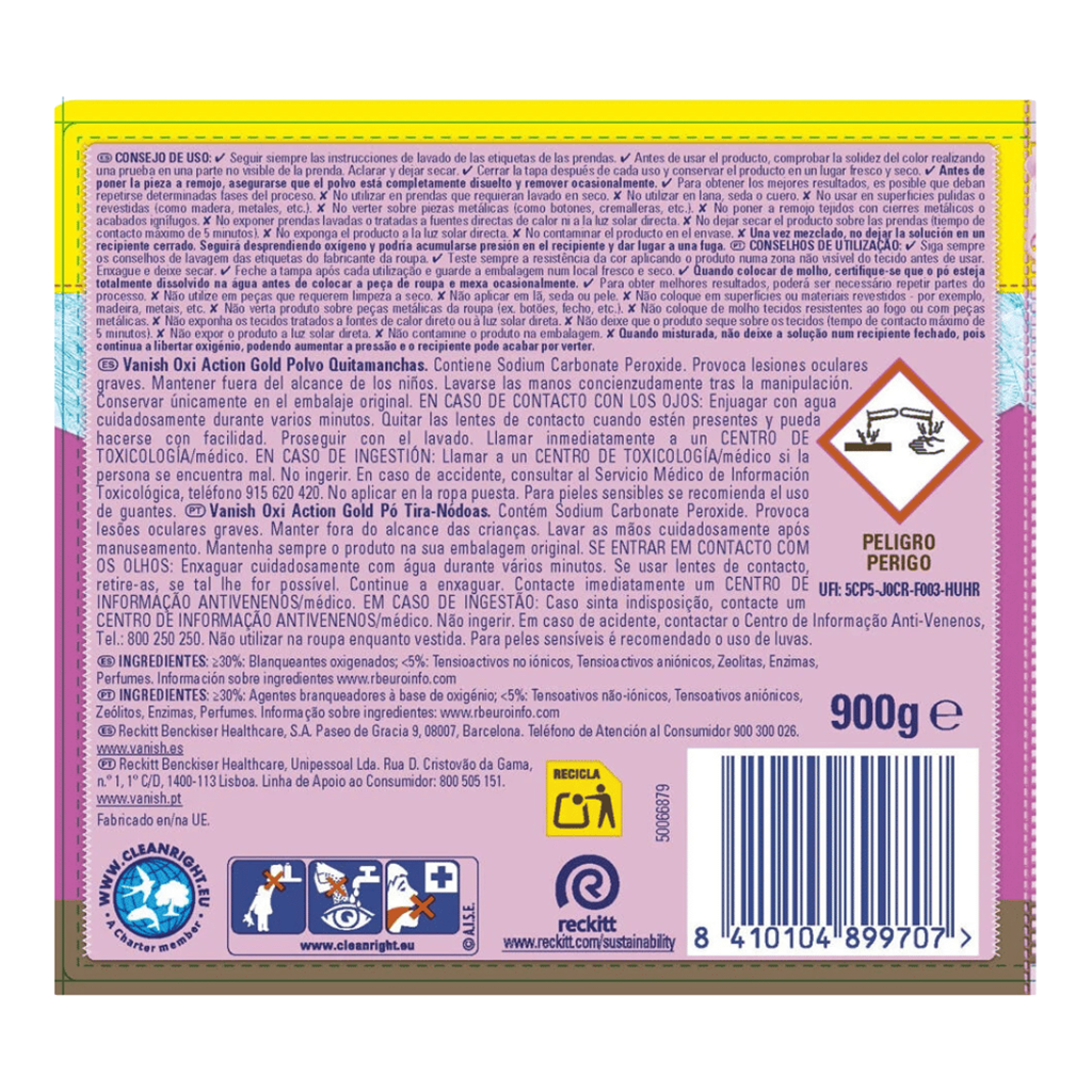 Vanish Oxi Action tira manchas é um detergente tira-nódoas que lhe permite cuidar de cada detalhe da sua roupa de forma fácil e simples, retirando nódoas difíceis e numa só lavagem, graças à sua fórmula com oxigénio ativo