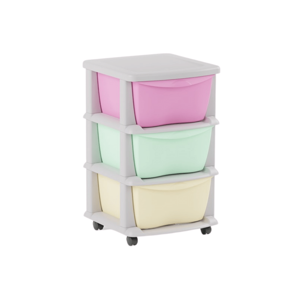 Módulo de arrumação de plástico com 3 gavetas para criança na cor rosa, verde e amarelo bebé.