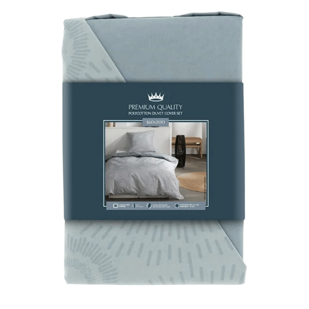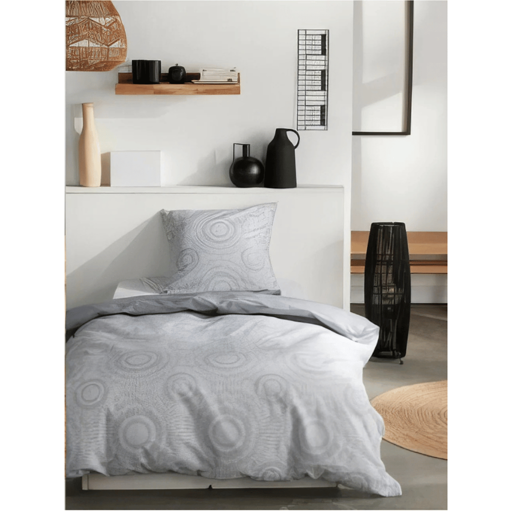 Conjunto capa de edredão e fronha, com um padrão sutil de raios ou linhas texturizadas em tons suaves, sendo muitas vezes reversível para maior versatilidade no quarto.