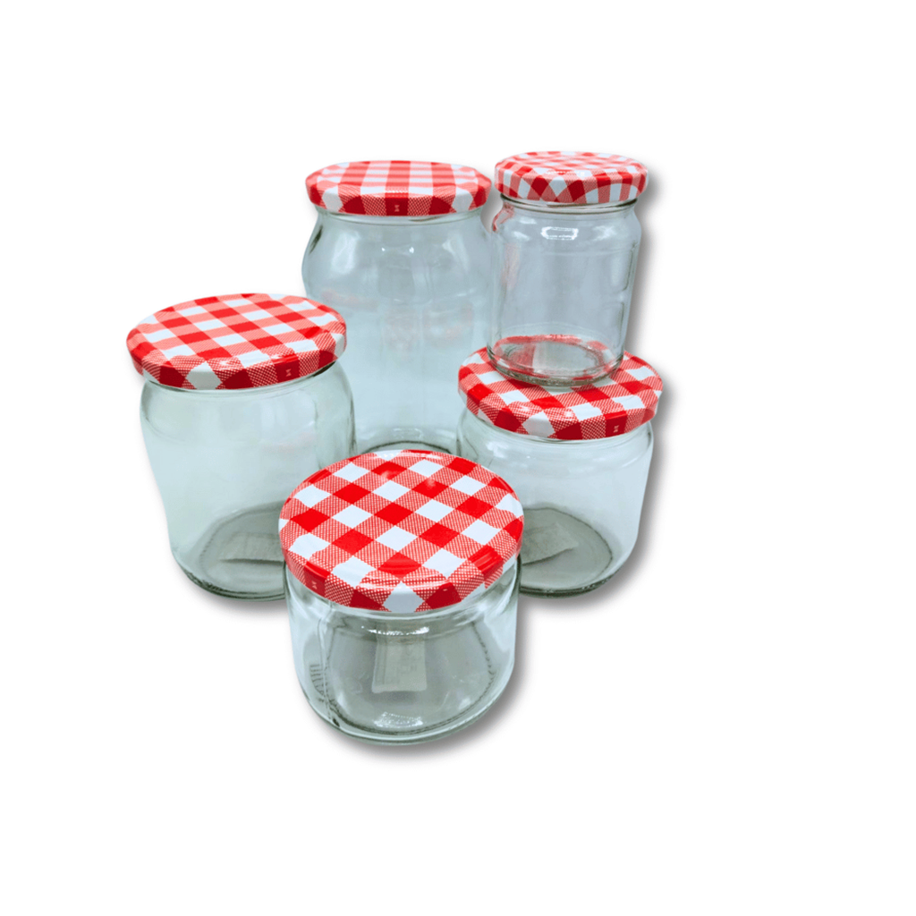 Frasco de vidro com tampa decorada, ideal para os seus doces e compotas.