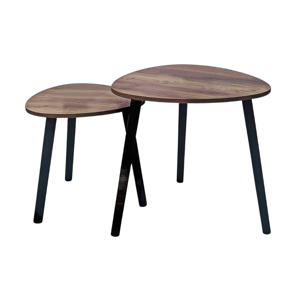 Conjunto de 2 mesas com tampo de madeira e pernas de cor preta.