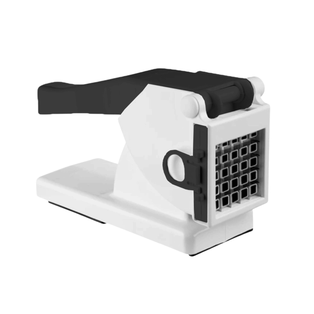 Cortador de batatas manual com mecanismo de pressão e estrutura em plástico.